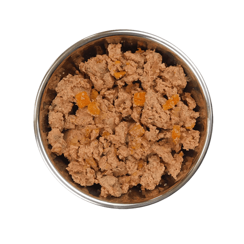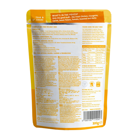 85% Chicken (includes Fresh Deboned Chicken, Chicken Broth), Courgette, Carrot, Sweet Potato, Tomato, Seaweed, Lucerne, Green Lipped Mussel Extract, Parsley, Celery, Chicory Root, Turmeric, Aniseed, Green Tea, Minerals.