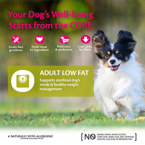 WELLNESS CORE Small Breed Dog Adult Low Fat Turkey 1.5kg is a premium, grain-free dry dog food specially formulated to support the unique nutritional needs of small breed adult dogs, featuring high-quality turkey protein with reduced fat for optimal weight management and overall wellness.