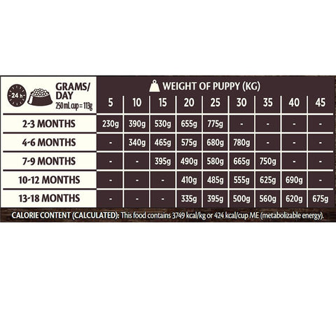Every dog is a little different, so optimal feeding amount may vary with age, size, activity level, breed and environment. Divide the total grams per day by the number of times you feed your dog per day. Please use the information as an initial recommendation only and adjust as needed. Always provide access to clean, fresh water.