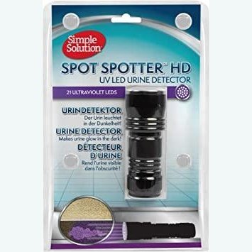 You can smell it. You know it’s there. How are you going to find that hard-to-find urine stain? Simple Solution Spot Spotter HD UV Pet Urine Detector is the tool you need, harnessing the power of ultraviolet light to reveal hidden dog and cat urine stains on your carpet, bedding, or furniture. 21 powerful ultraviolet LEDs make urine stains glow in the dark, revealing hidden spots that are undetectable to the unaided human eye! For best results, the room should be as dark as possible.